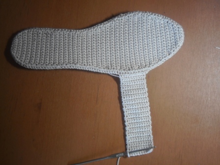 Стелька готова. Теперь требуется связать верх босоножек. Он может быть раличный – кто-то любит закрытые босоножки, кто-то открытые. Я не умею вязать красиво закрытые босоножки, поэтому верх у меня будет сделан из двух полосок. Намечаю места расположения полосок, присоединяю нить к стельке и провязываю первый ряд столбиками без накида, вводя крючок в петли стельки. Количество рядов и ширину полоски верха босоножек рассчитываем по желанию и в соответствии с размером ноги.