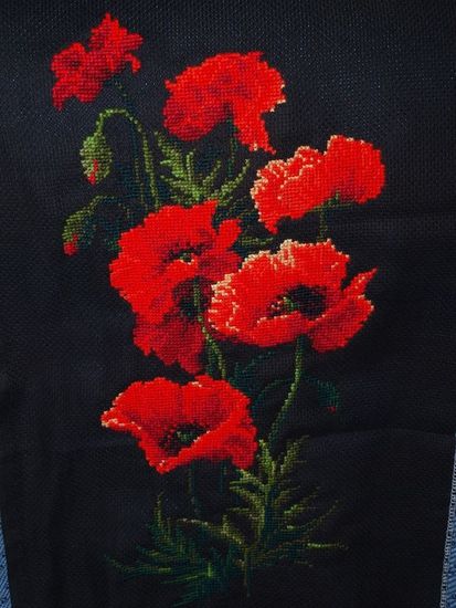 | Один раз вышивала на заказ салфетку с красными маками на черной канве (примерно такую как на фото), и хочу сказать, что вышивать было сложно. Жаль, мне никто не подсказал подложить под канву белую ткань. Но вышитая работа получилась, конечно, обалденно красивая.