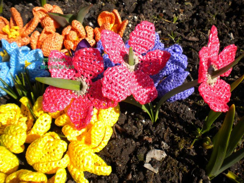 | Раньше , когда только начинала вязать из пакетов сумки , меня это так захватило , что было не до названий . А потом на третьей сумочке названия промто стали необходимостью . Все сумки теперь с названиями . Эта сумка была задумана в теме "Весна " и плавно перетекла в "Весенние проталинки " . Белая основа - снег , крокусы - первоцветы , коричневая застёжка , - ветки у миндаля такого цвета весной и цветы миндаля такие же . Ну ещё ручка будет в зелёных тонах и придумала новое присоединение ручек . Такого ещё не делала .