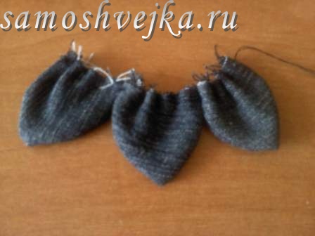 Детали листиков следует сложить лицевыми сторонами вовнутрь попарно, обтачать каждый листик цветка с двух сторон треугольника, припуски срезать до 2 мм, вывернуть на лицевую сторону (машинную строчку лучше сделать 2-3 мм), уголки листиков выправить иглой. Основание каждого листика присобрать на нитку поочередно и пришить к розе с изнаночной стороны.